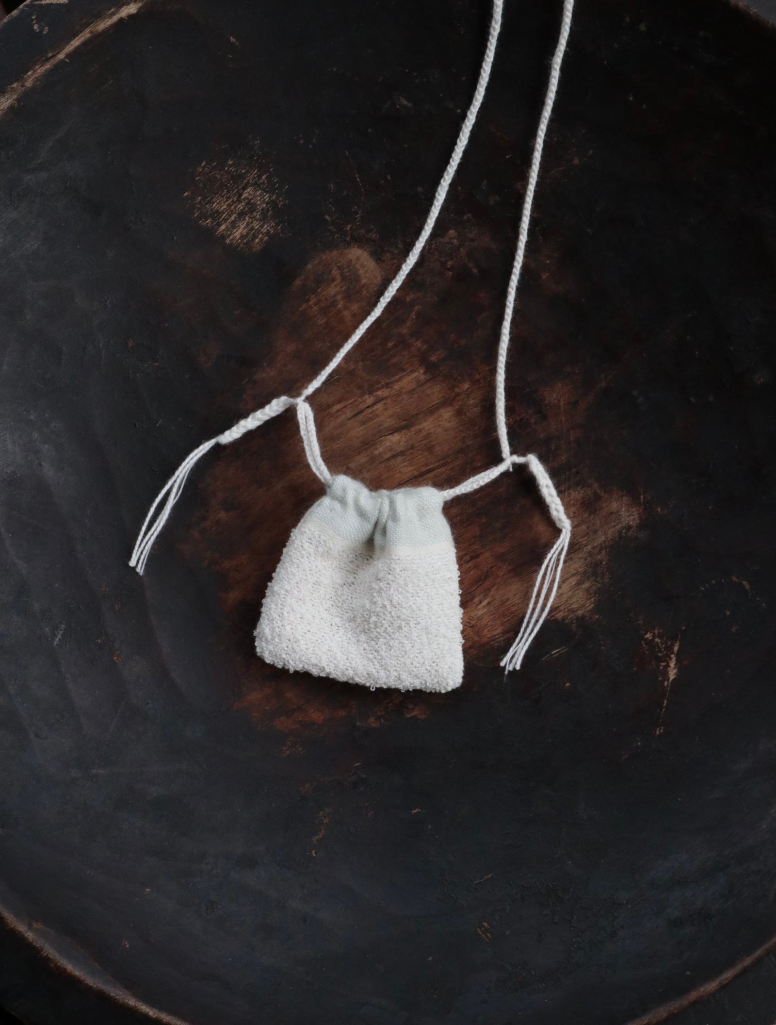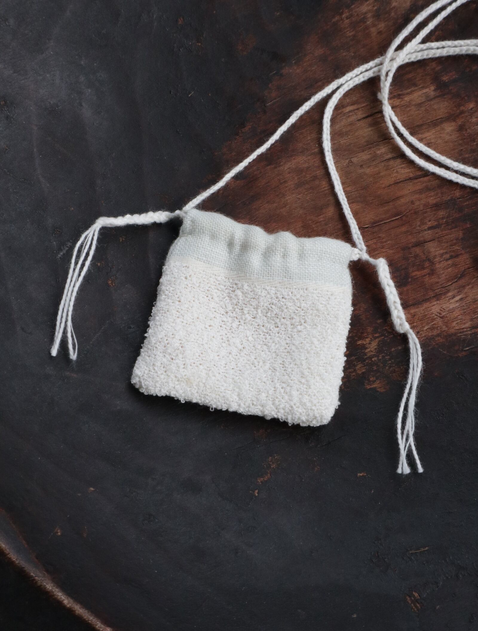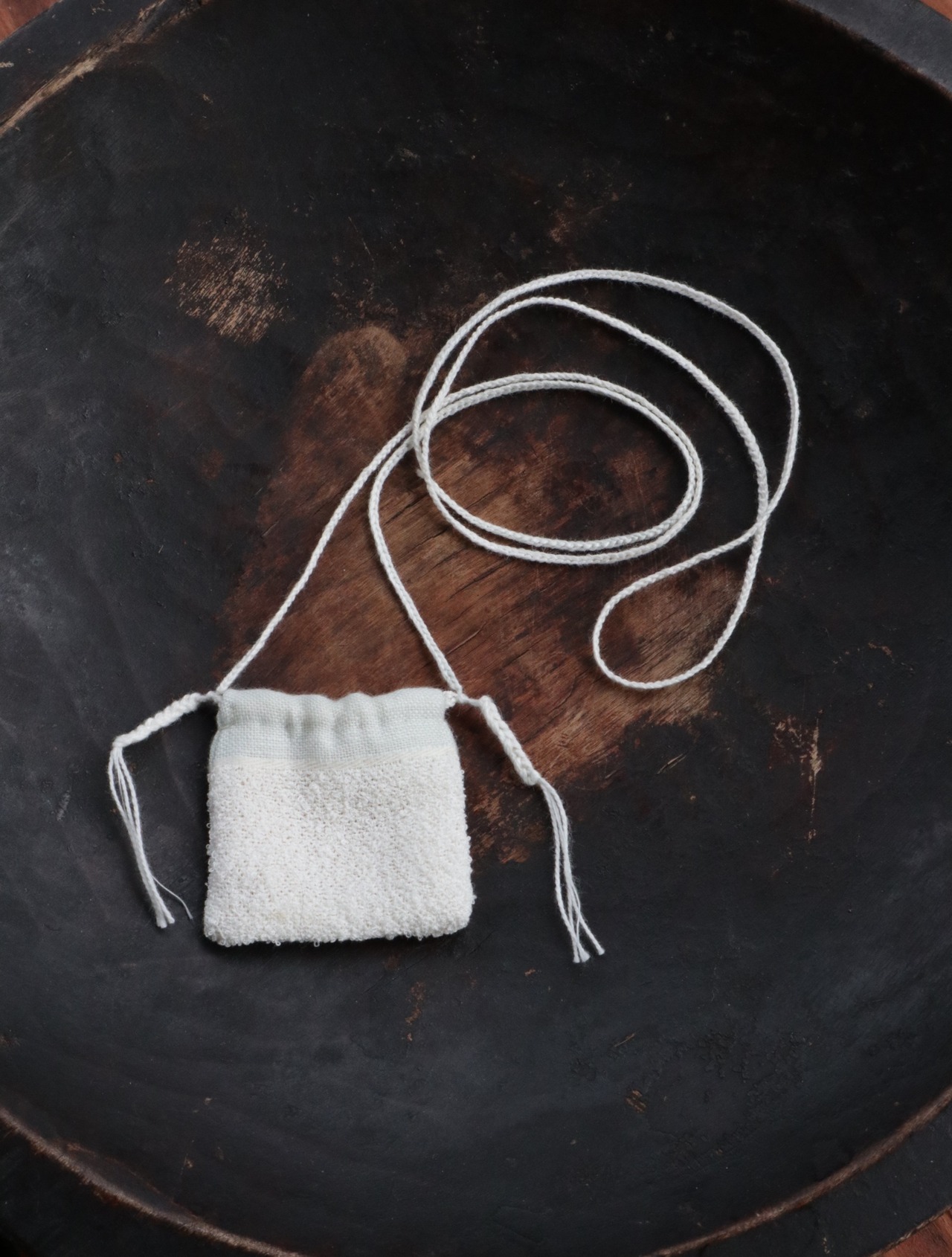 細番手の生成糸で織り上げた小さな袋物です。
